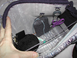 Another side-effect of using the plastic canvas for the interior/frame, is that you can attach D-rings around the sides and then attach things to the D-rings. The detachable bag in the last photo is attached to a D-ring with a crab hook. The scissors are on one of those retractable holders for ID tags (found at Office Depot).