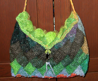 Here is the photo of the Entrelac Bag. I used 2 skeins of the Noro Silk Garden Lite. This works up pretty quick, and you really just have to trust the color changes to the yarn. I did end up with the brightest colors at the end– so they worked out to be on the bottom of the bag. Not sure how I might avoid that in future, since its hard to know what colors are really in the skein. But a fun and quick project.