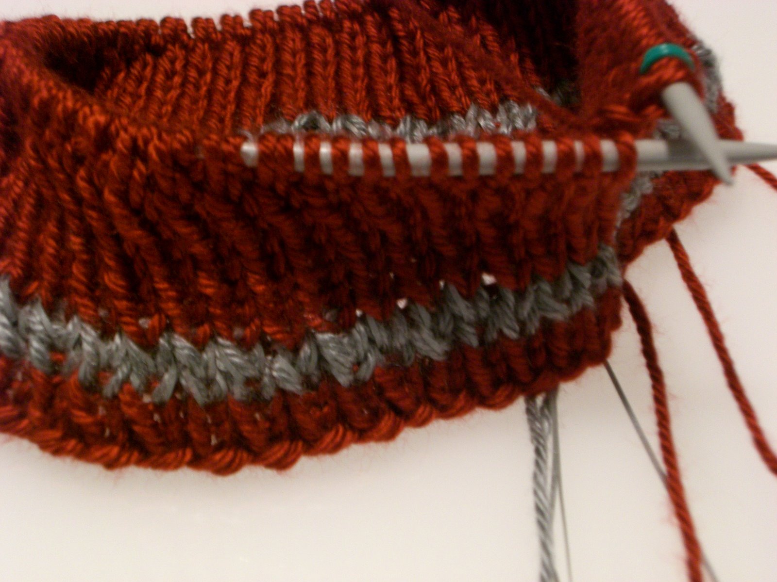 If you want to add a bit more safety in with the love you knit into caps for your family– use some reflective yarn! Retroglo is the yarn that I’m using here. Its actually made with tiny little glass beads on both sides and is a flat tape. I’m working it into the knit fabric by carrying it along with my other yarn. Since it is rather grey looking when not reflecting, I’m using it with grey yarn.