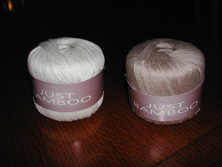 This is “Just Bamboo” from Sirdar. Its ribbony and I understand that the swatches will tend to shrink up when wet. So should be interesting. I picked one of the Manilla and one Nutmeg (although it could have been Vanilla and Nutmeg really!) they have a few other colors in pinks, light blues and neutrals. (Not nearly the variety of colors of the Bambu 7).