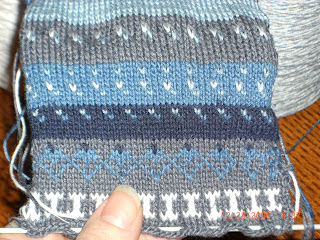 Interesting that with the flash the blue on grey in the bottom shows up. Just looking at the swatch with out the camera lens, you can hardly see the pattern there. I also did some playing with which yarn to hold in which hand for more “pop”. I’m going to use accent color in my left hand and background in my right, as I normally do.